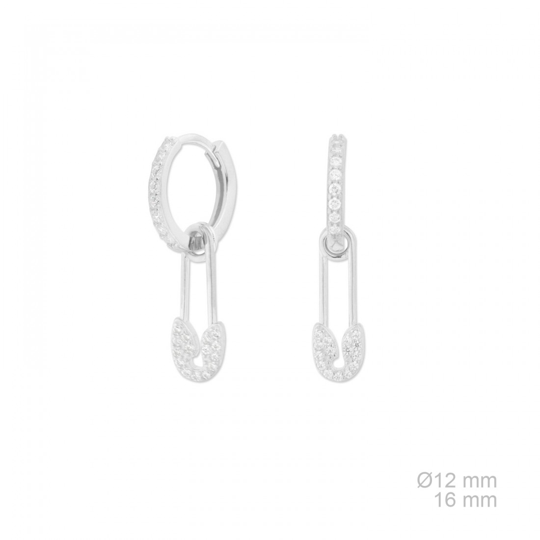 Aros de Plata de Ley de 12 mm de diámetro de los que cuelga un pequeño imperdible con circonitas blancas. Incluye caja.