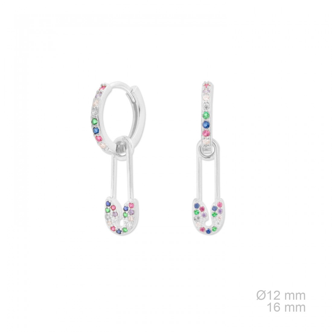 Aros de Plata de Ley de 12 mm de diámetro de los que cuelga un pequeño imperdible con circonitas de colores. Incluye caja.