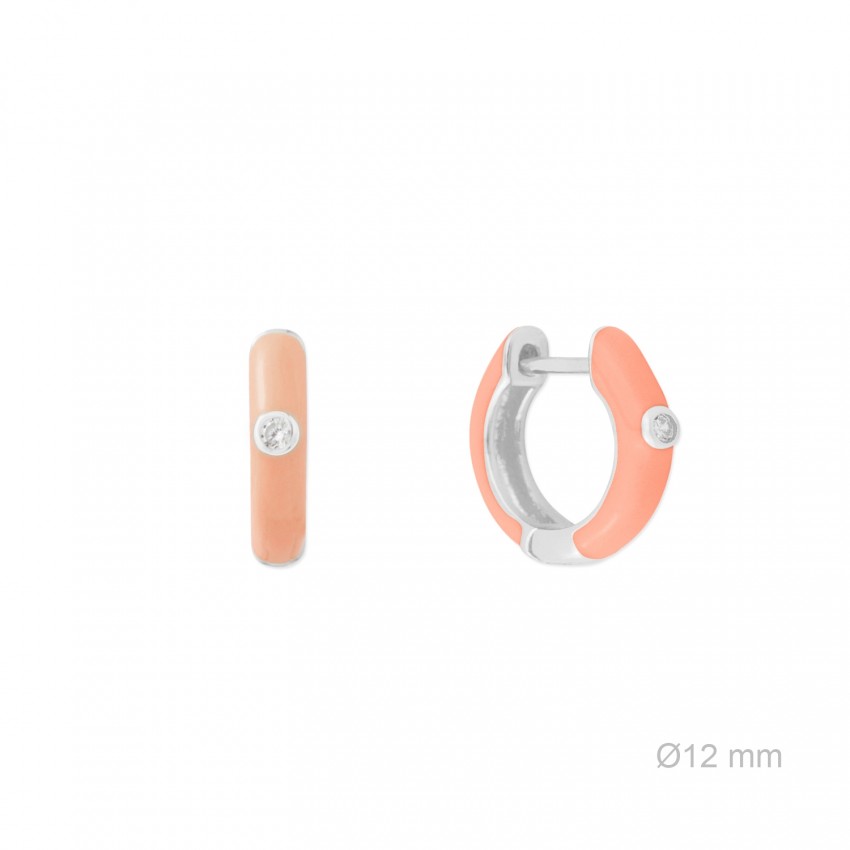 Aros de Plata de Ley de 12 mm de diámetro con esmalte coral y circonita blanca. Incluye caja.