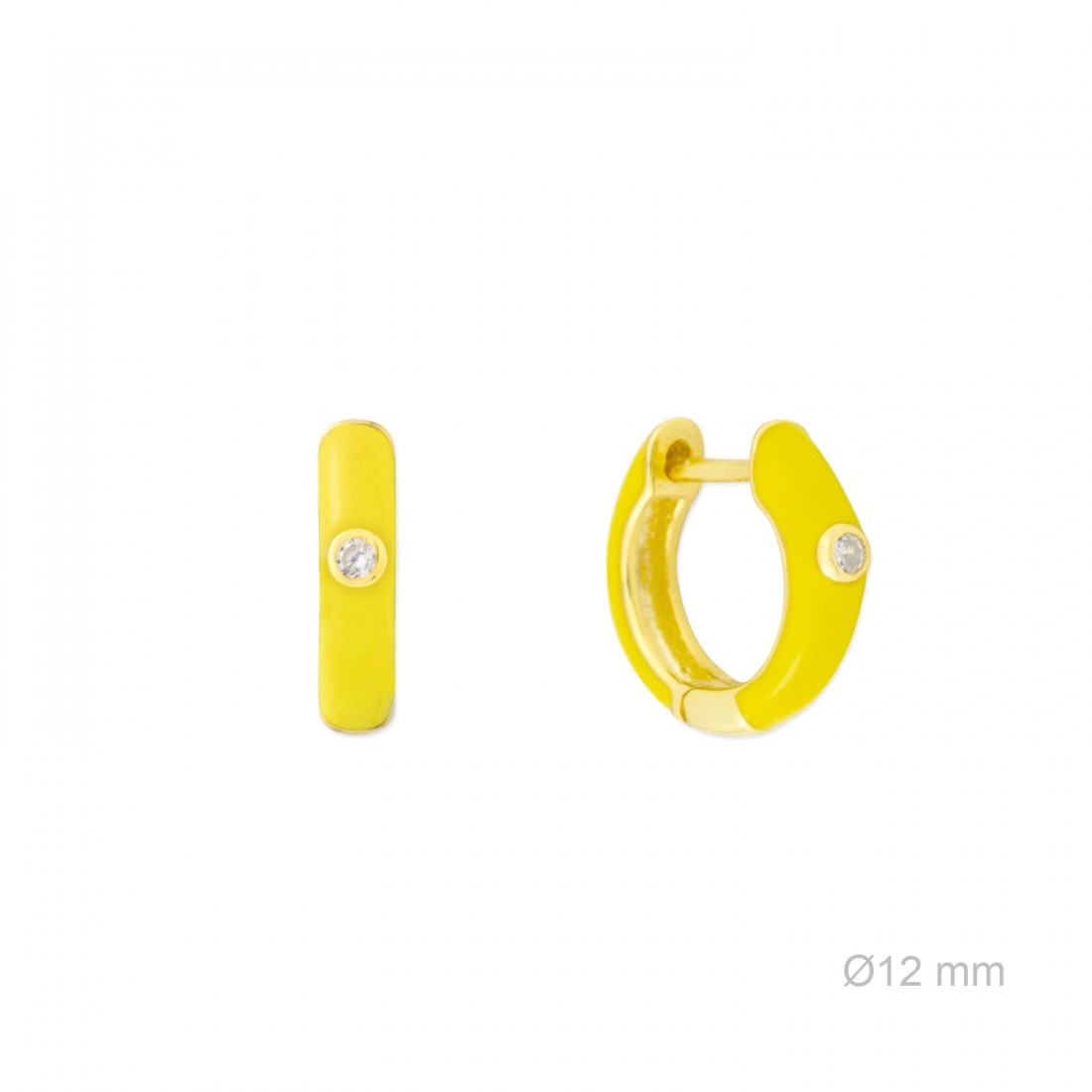 Aros de Plata de Ley chapados en oro de 12 mm de diámetro con esmalte amarillo y circonita blanca. Incluye caja.