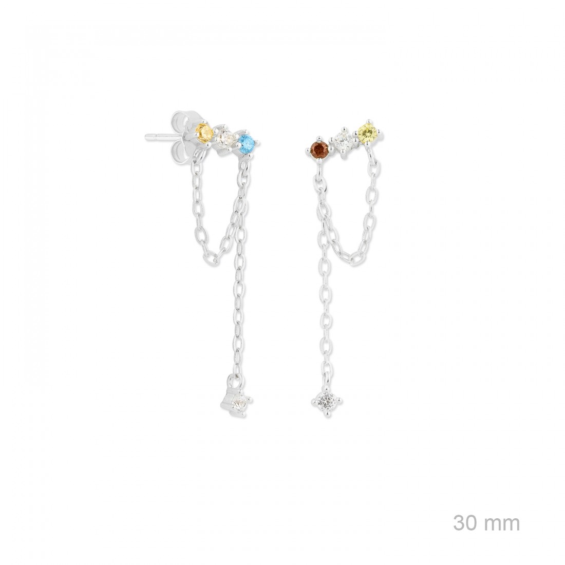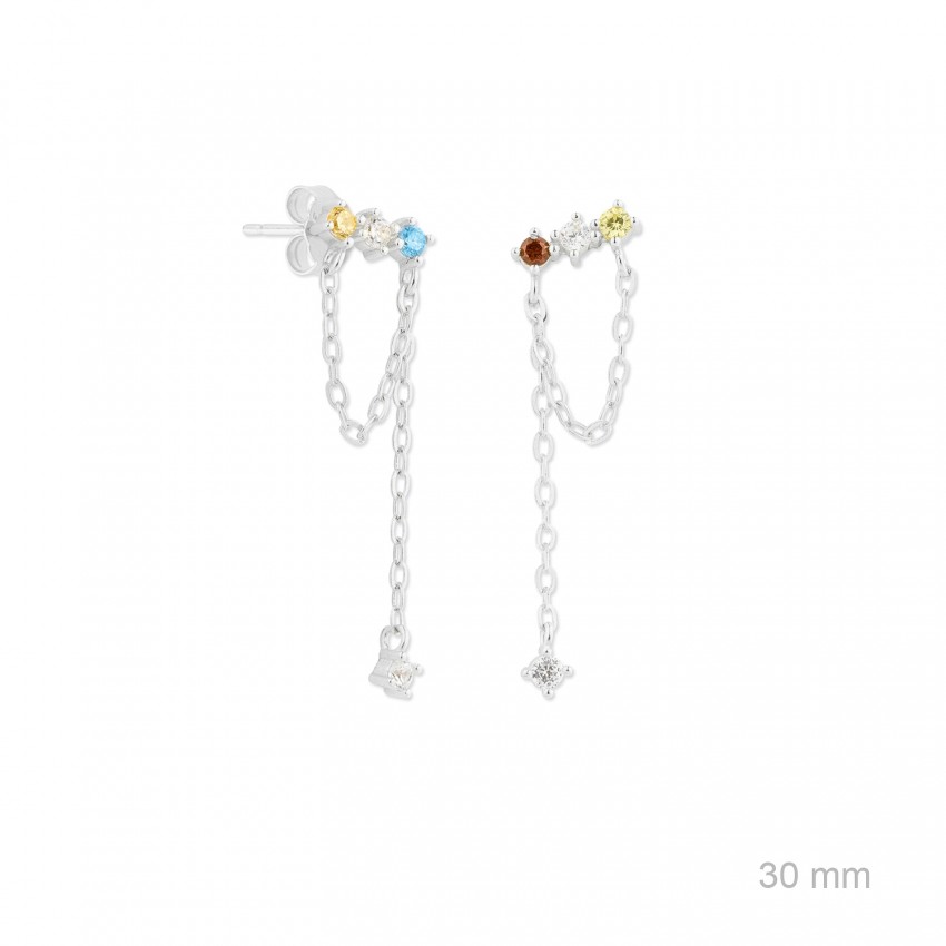Pendientes Plata de Ley de colores asimétricos con cadena y circonitas de color de 2 mm.