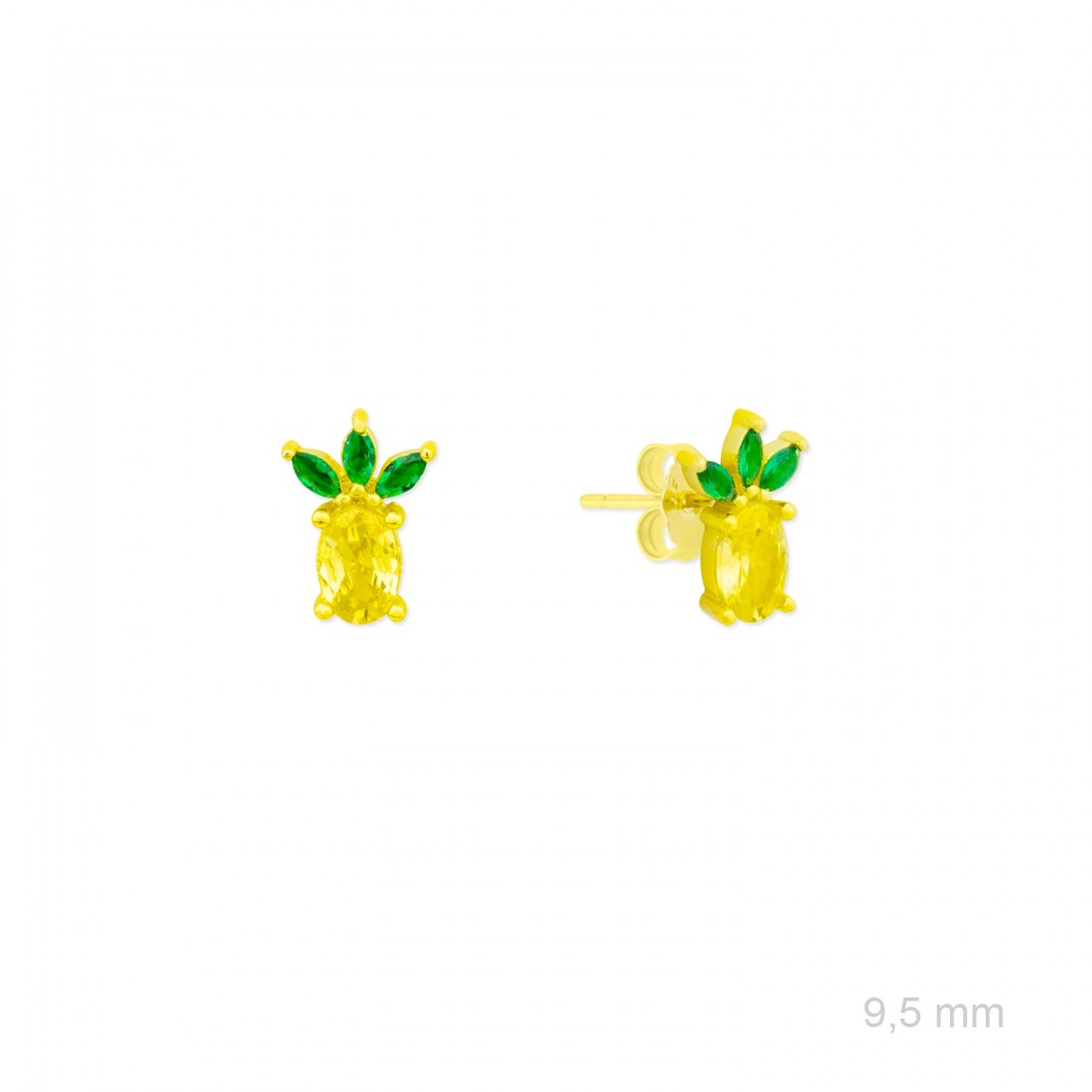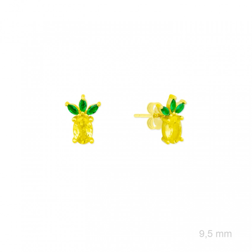 Pendientes de Plata de Ley chapados en oro con forma de piña de 9,5 mm de alto y circonitas de color amarillo y verde.