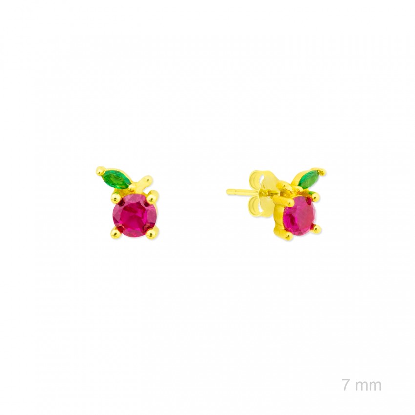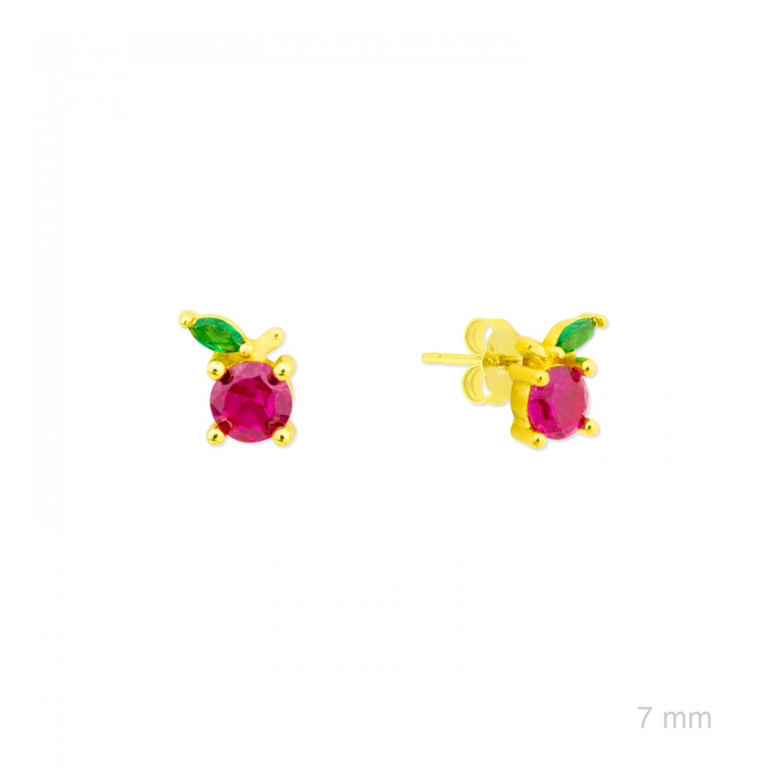 Pendientes de Plata de Ley chapados en oro con forma de manzana de 7 mm de alto y circonitas de color fucsia y verde.