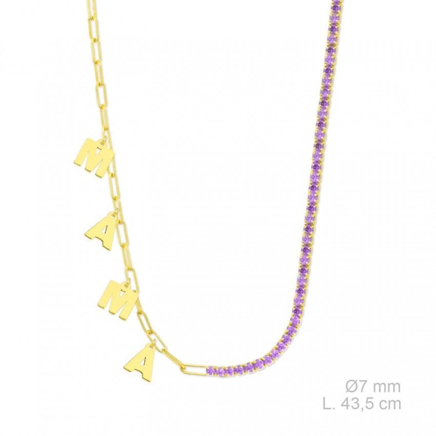 Gargantilla de Plata de Ley chapado en oro con la palabra MAMA en charms y cadena con circonitas de color amatista.