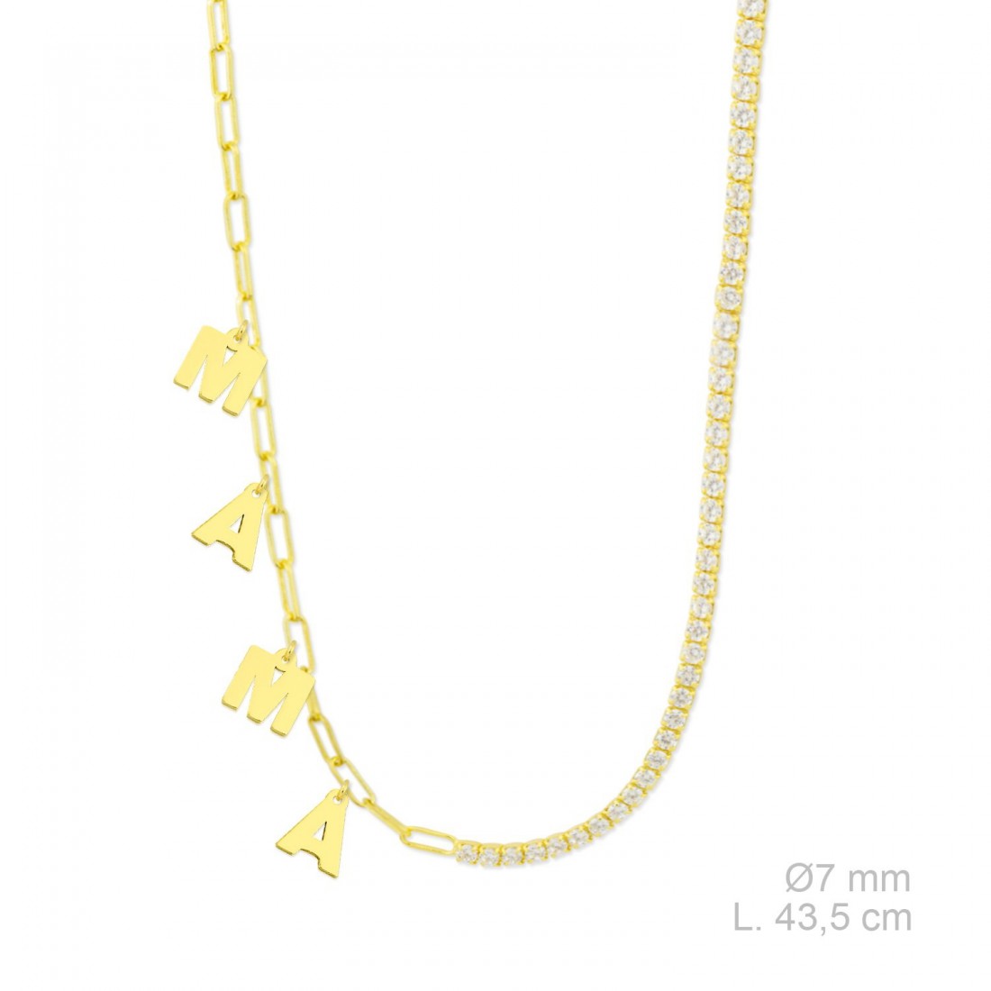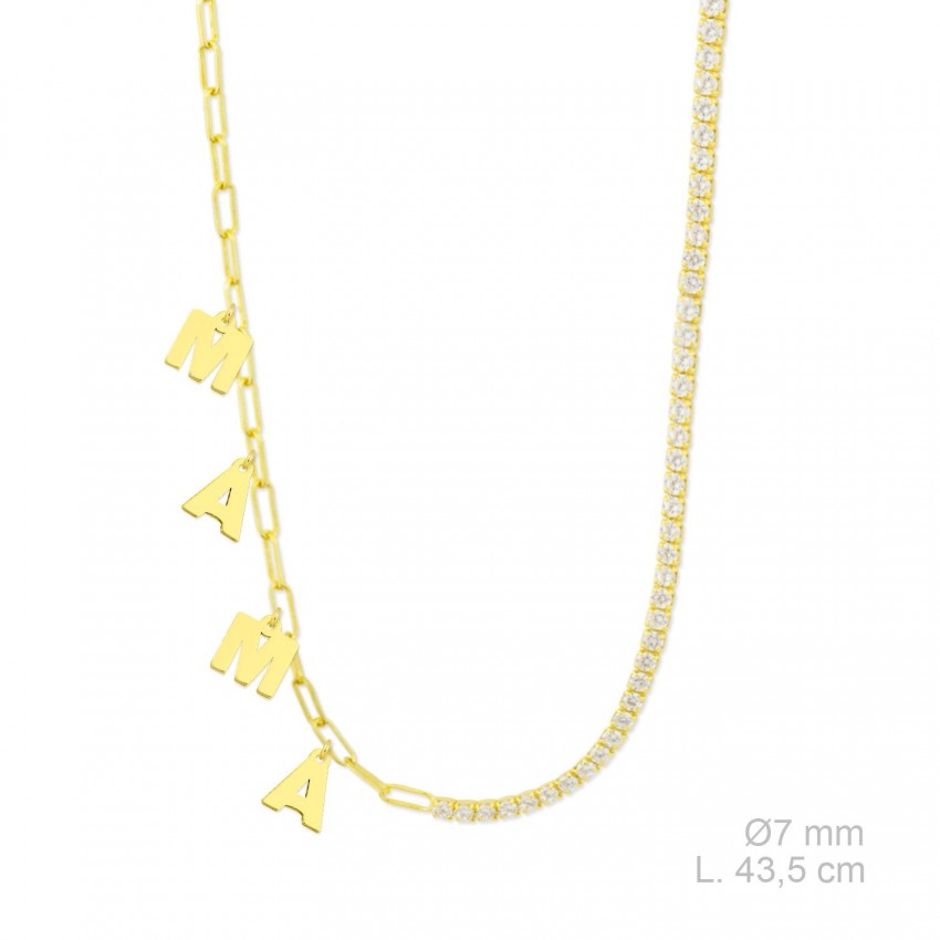 Gargantilla de Plata de Ley chapado en oro con la palabra MAMA en charms y cadena con circonitas de color blaco.