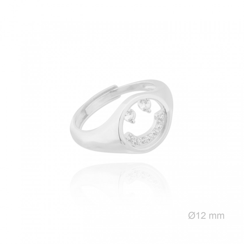 Sortija de Plata de Ley con motivo smiley o carita sonriente de 12 mm de diámetro y circonitas blancas.