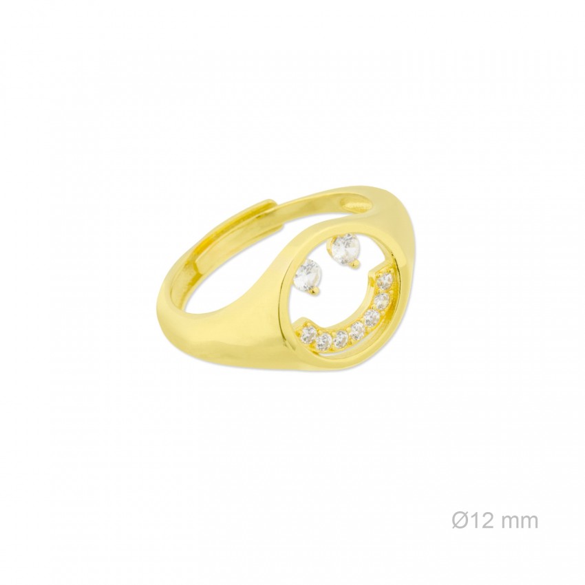 Sortija de Plata de Ley chapada en oro con motivo smiley o carita sonriente de 12 mm de diámetro y circonitas blancas.