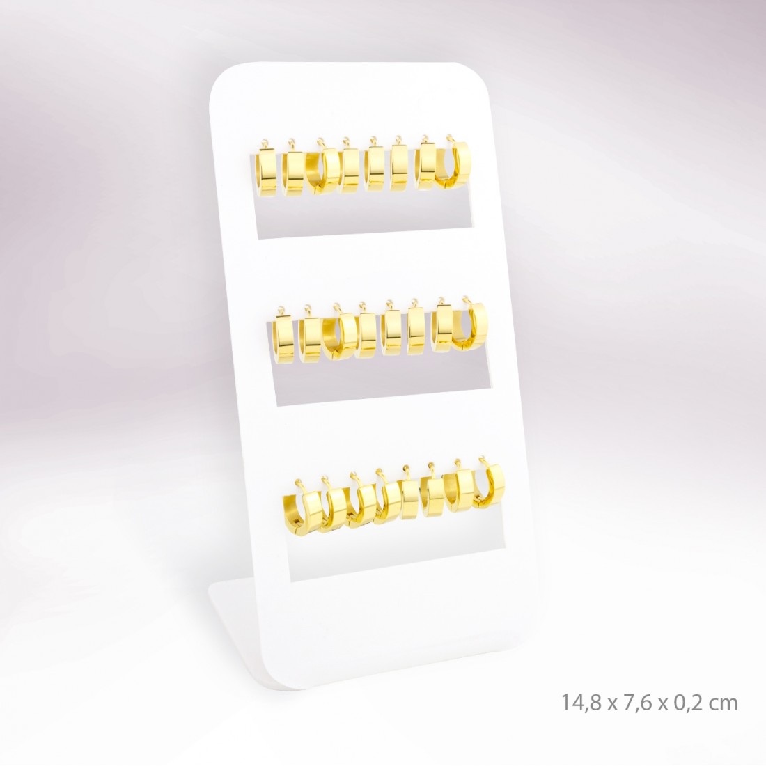 Expositor de resina con 12 pares de Aros de Acero inoxidable unisex en color dorado.