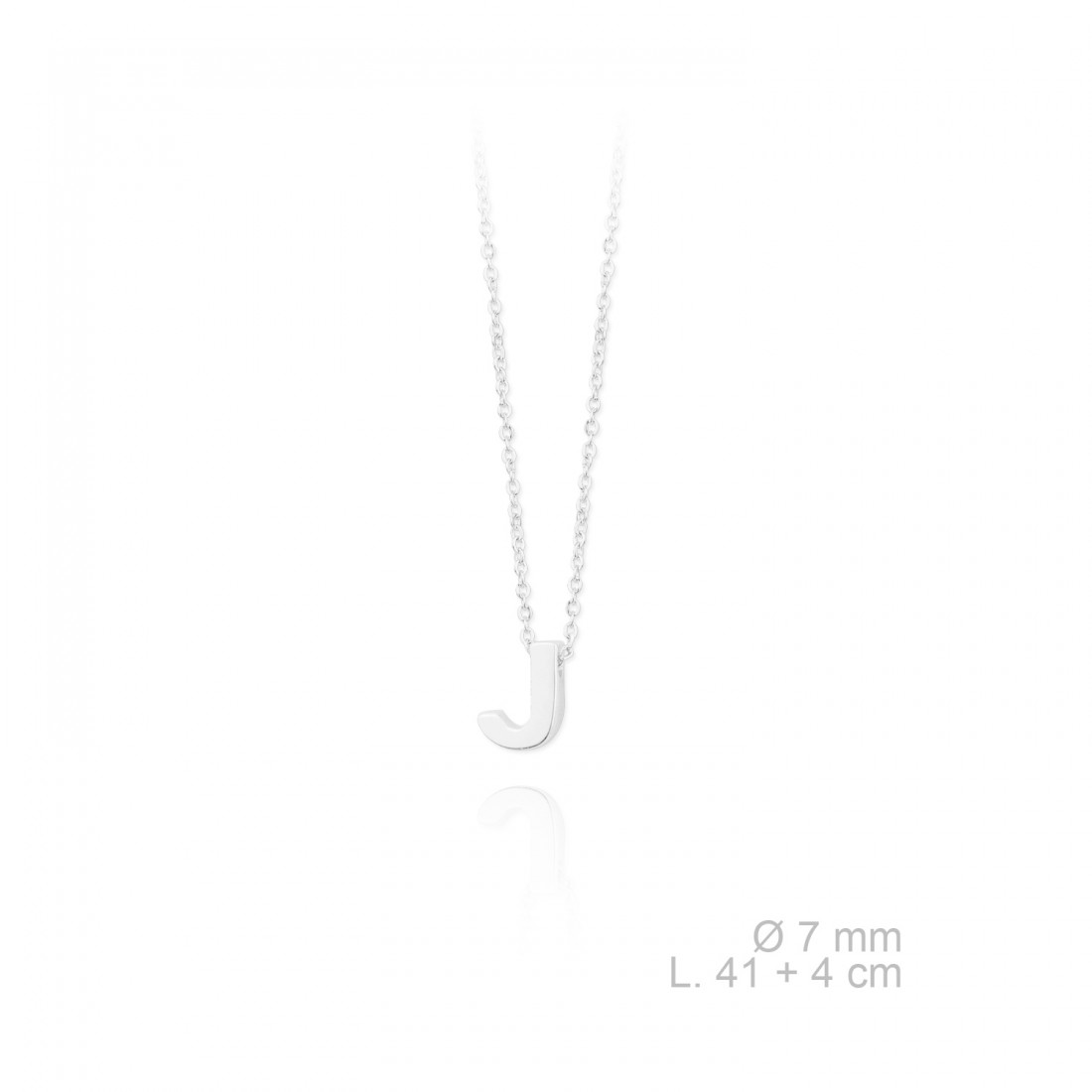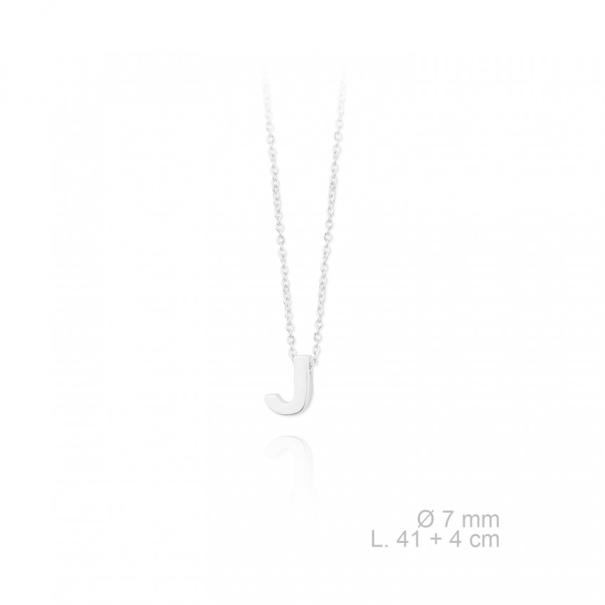Gargantilla de Plata de Ley. Letra J. Tamaño: 7 mm. Longitud de 41 cm más cadena de alargamiento de 4 cm. Incluye caja.