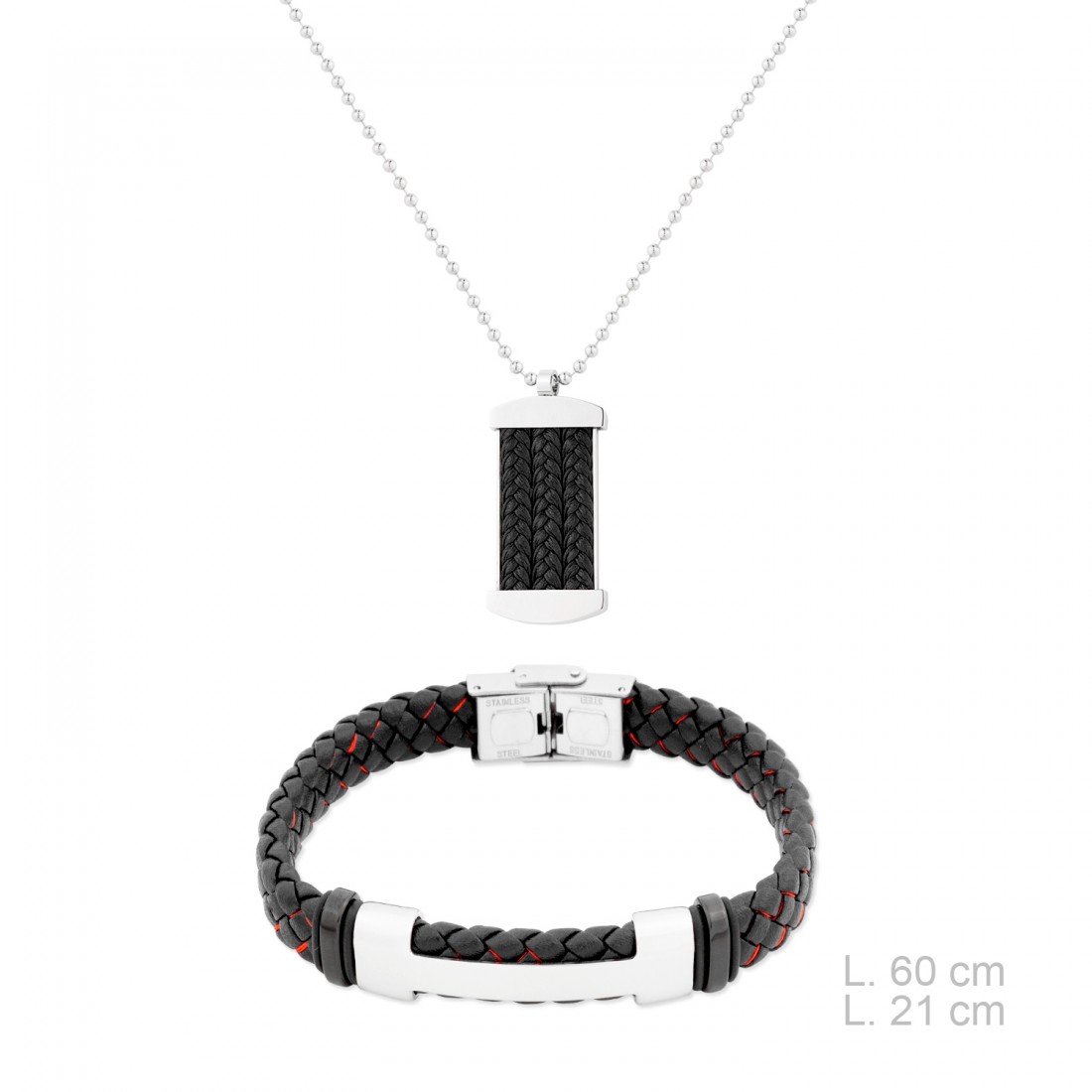 Juego de gargantilla y pulsera de Acero inoxidable con cuero trenzado negro y detalles en hilo encerao rojo. Tipo de cadena: cadena de bolitas de Acero.