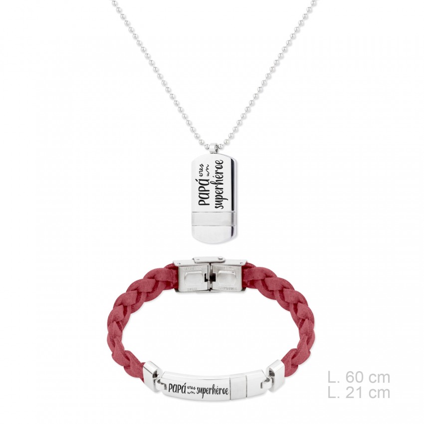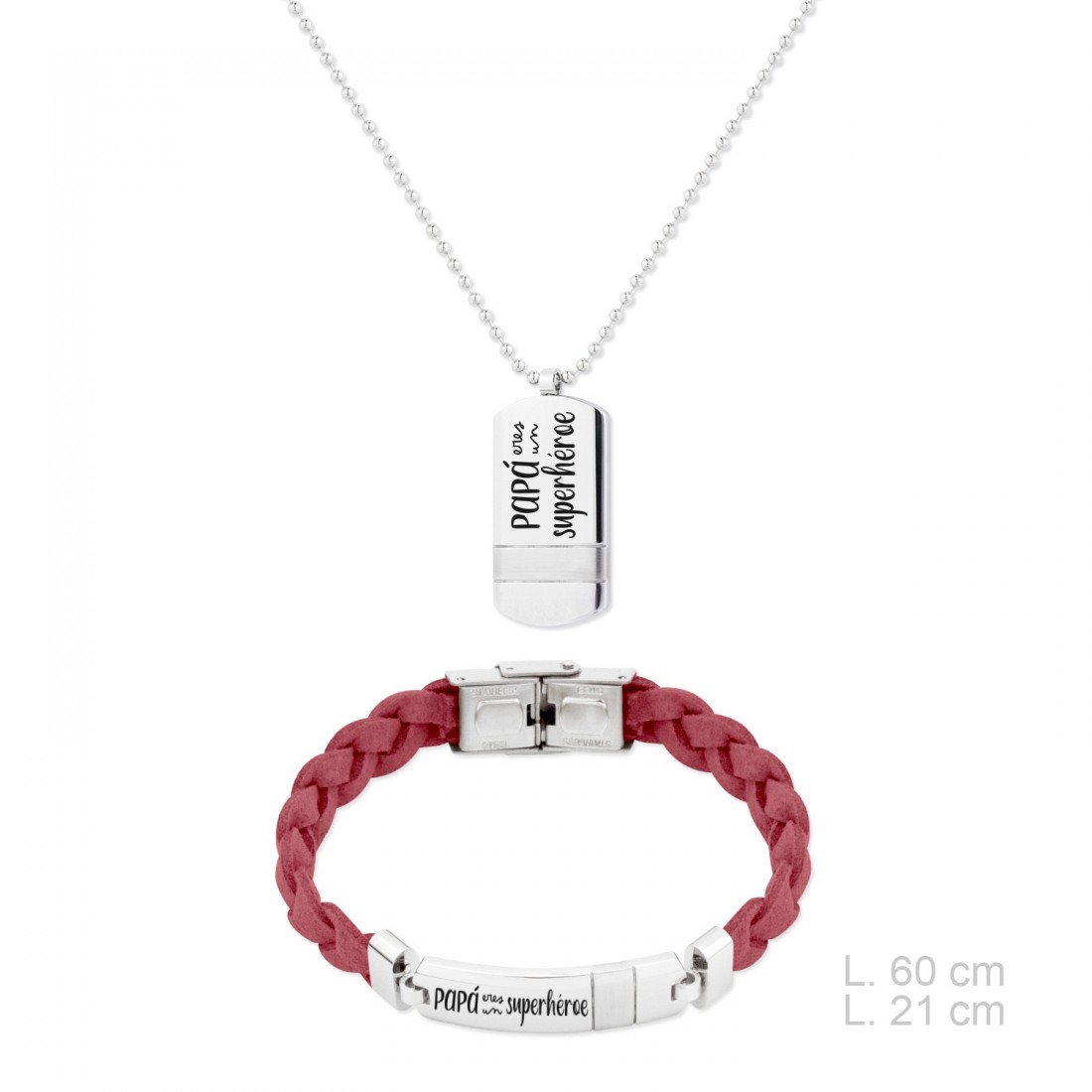 Juego de gargantilla y pulsera de Acero inoxidable con ante trenzado granate. Tipo de cadena: cadena de bolitas de Acero.