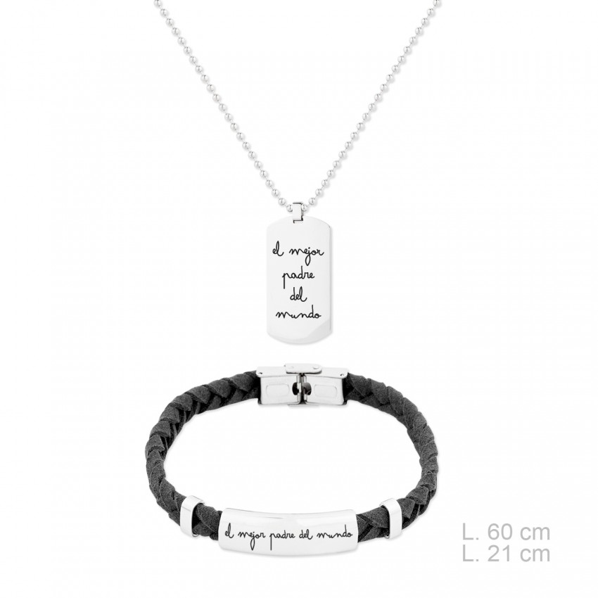 Juego de gargantilla y pulsera de Acero inoxidable con ante trenzado negro. Tipo de cadena: cadena de bolitas de Acero.