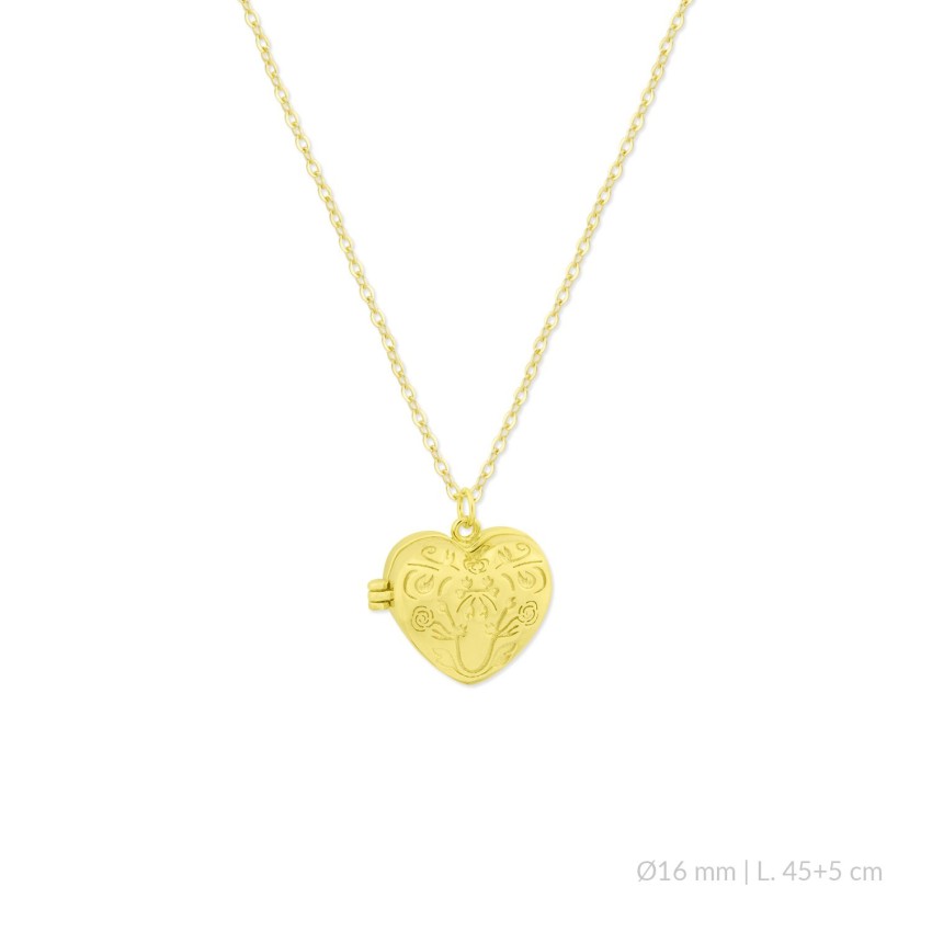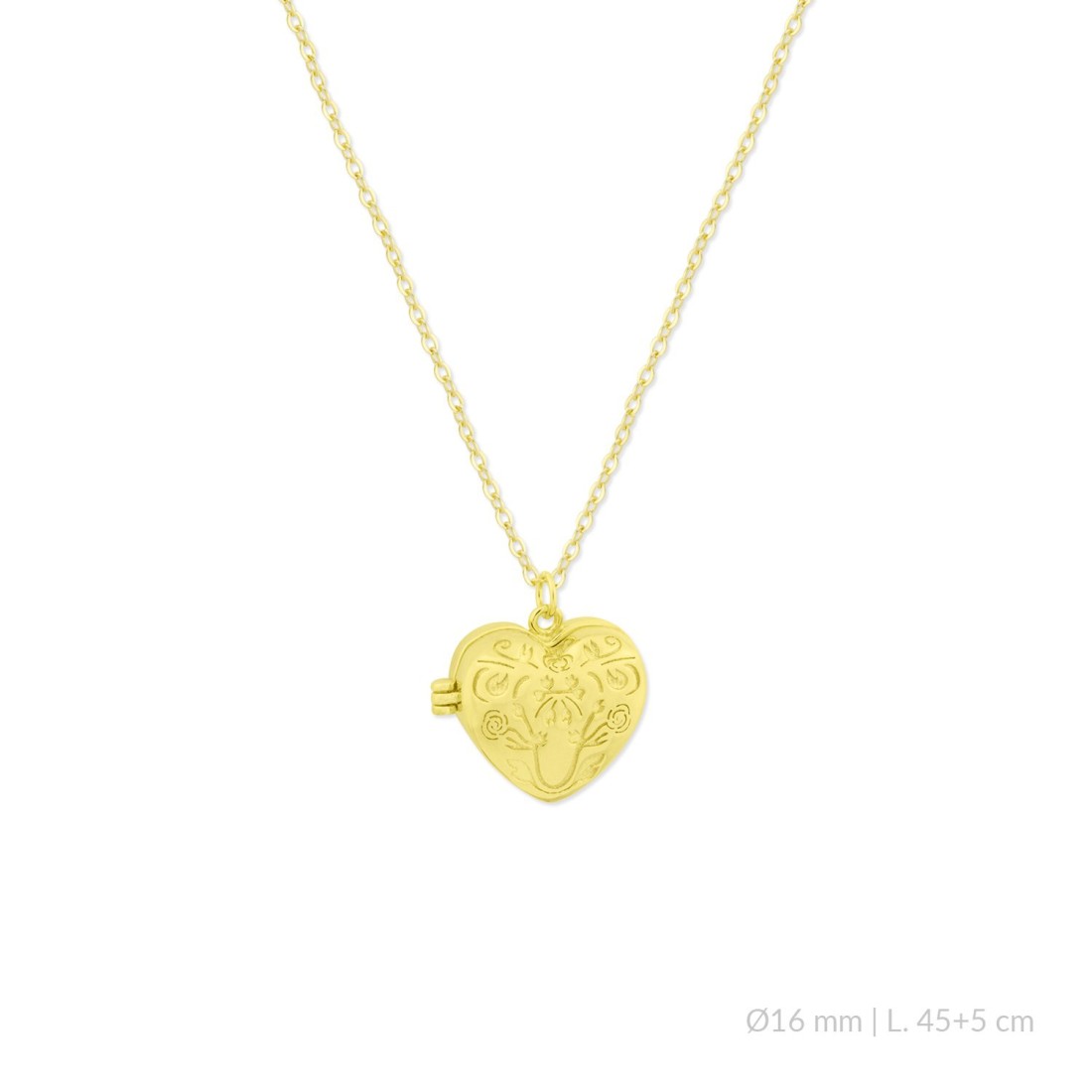 Relicario de Plata de Ley chapado en oro en forma de corazón grabado con motivos de encaje. El medallón se abre para guardar amuletos de la suerte, fotografías, etc con un cierre de imán.