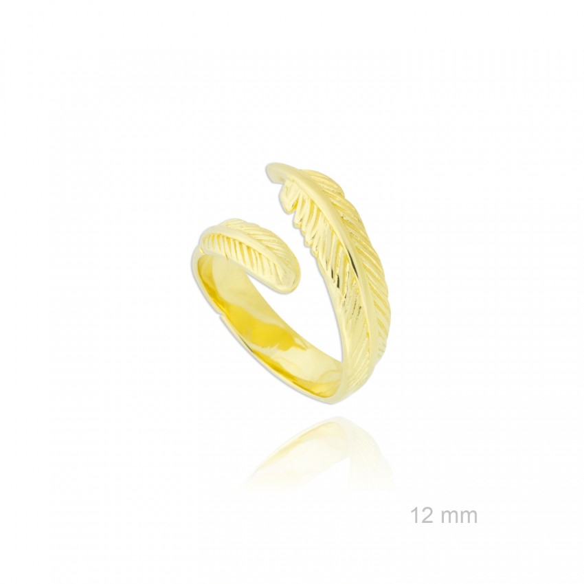 Sortija de Plata de Ley chapada en oro con forma de pluma. Ajustable a diferentes medidas. Incluye caja.