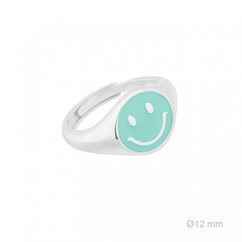 Sortija de Plata de Ley con motivo smiley o carita sonriente de 12 mm de diámetro y esmalte turquesa.