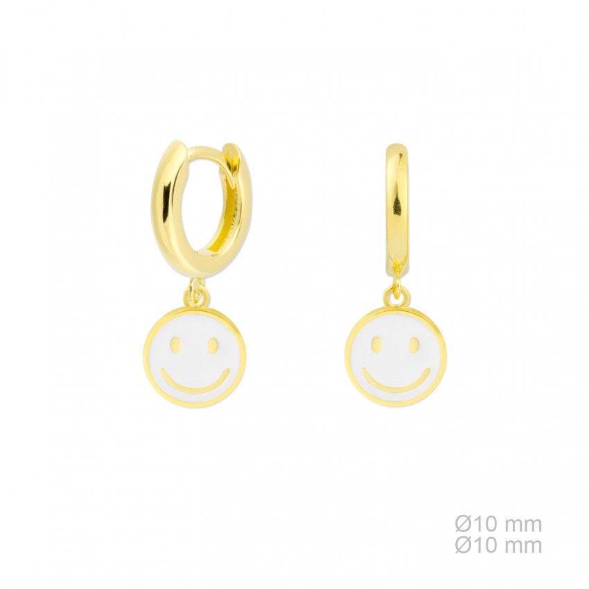 Aros de Plata de Ley chapados en oro de 10 mm con motivo smiley o carita sonriente de 10 mm de diámetro y esmalte blanco.