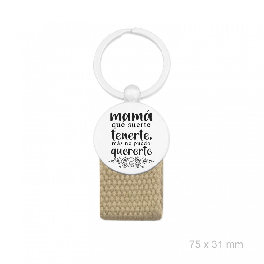 Llavero de metal con motivo de MAMA y tela de algodón de color camel.