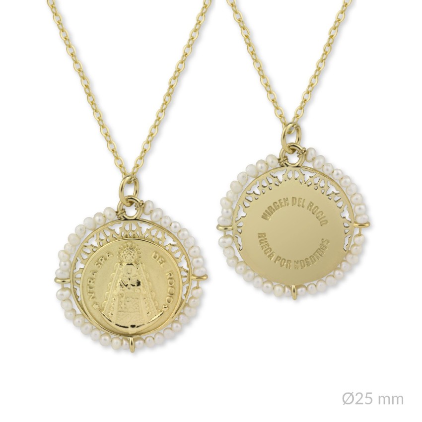 Delicada medalla cuyas perlas simbolizan la "Blanca Paloma" o la "Reina de las Marismas". El anverso podemos ver un exquisito relieve de la virgen con un acabado pulido que contrasta con el fondo mate arenado, aportando un contraste que resalta la imagen. En el reverso, tenemos en bajorelieve el texto "Virgen del Rocío. Ruega por nosotros".
