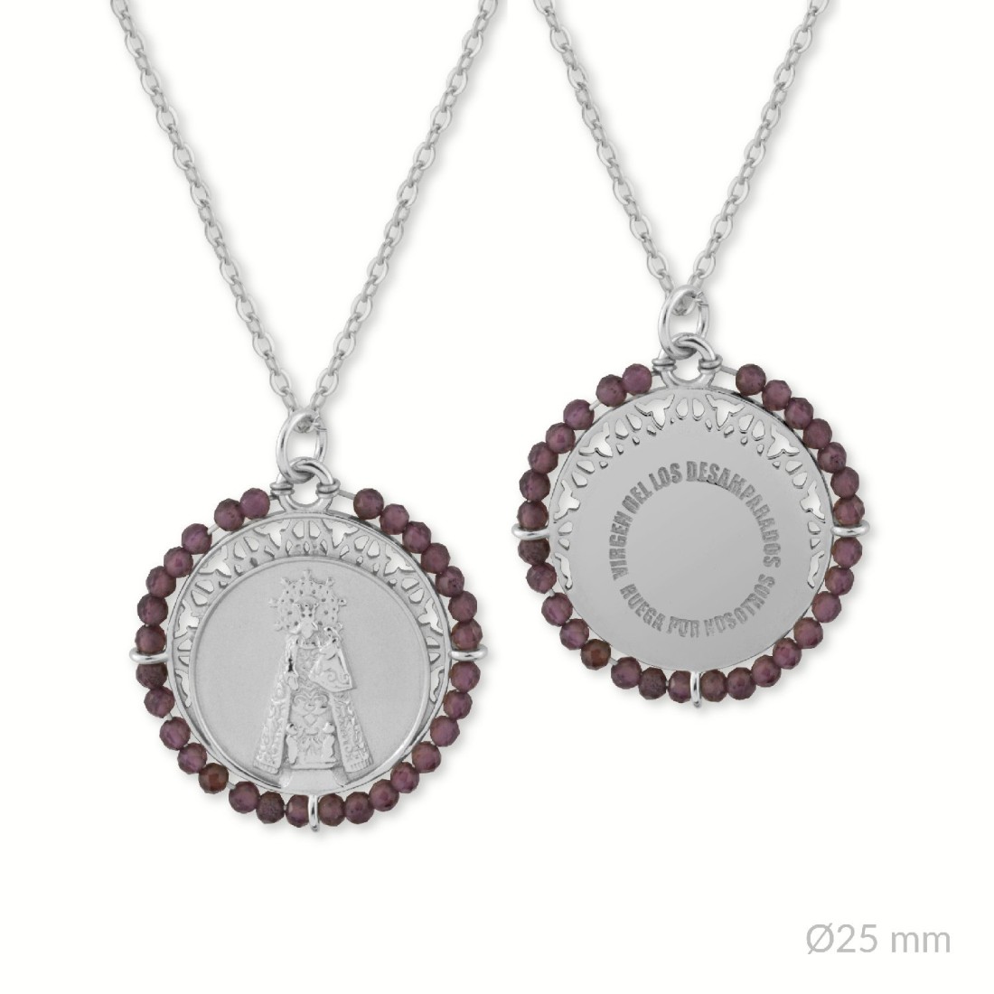 Medalla de Plata de Ley de la Virgen de los Desamparados con rocalla de amatista.