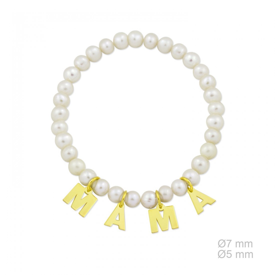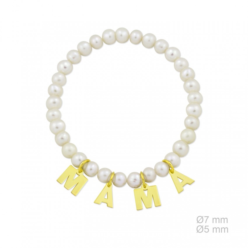 Pulsera de Plata de Ley chapada en oro con perla cultivada de 5 mm y con la palabra MAMA en charms. La perla natural puede tener variaciones de color y tamaño.