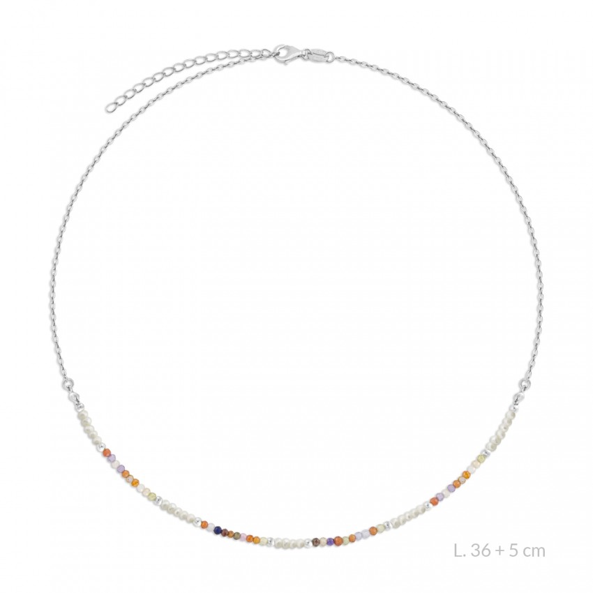 Gargantilla de Plata de Ley con perla barroca, rocalla facetada multicolor de 2 mm y 10 bolitas de plata. Tanto la piedra natural como la perla puede tener variaciones de color y tamaño.