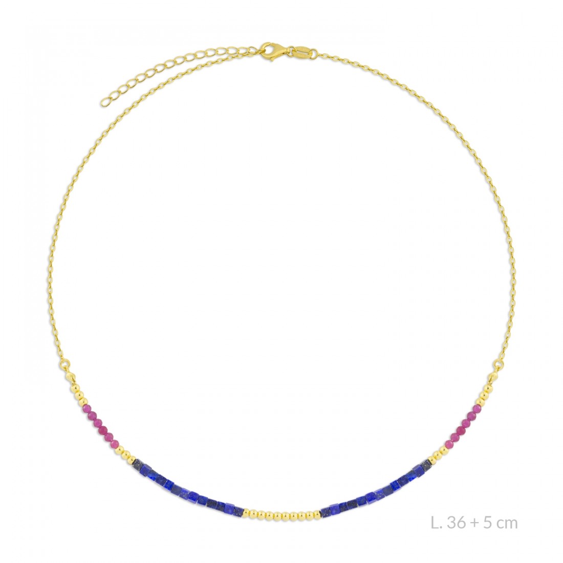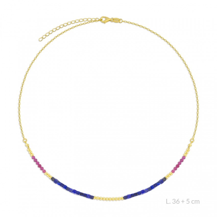 Gargantilla de Plata de Ley chapada en oro con lapislázuli, rocalla facetada rosa de 2 mm y detalles con bolitas de plata. La piedra natural puede tener variaciones de color.