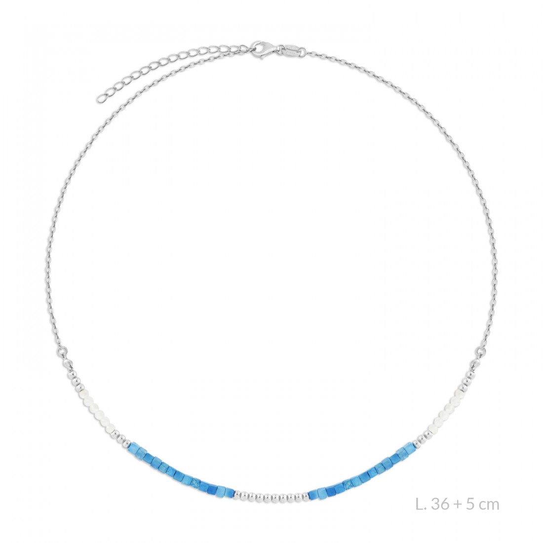 Gargantilla de Plata de Ley con turquesa, cuarzo blanco facetado de 2 mm y detalles con bolitas de plata. La piedra natural puede tener variaciones de color.