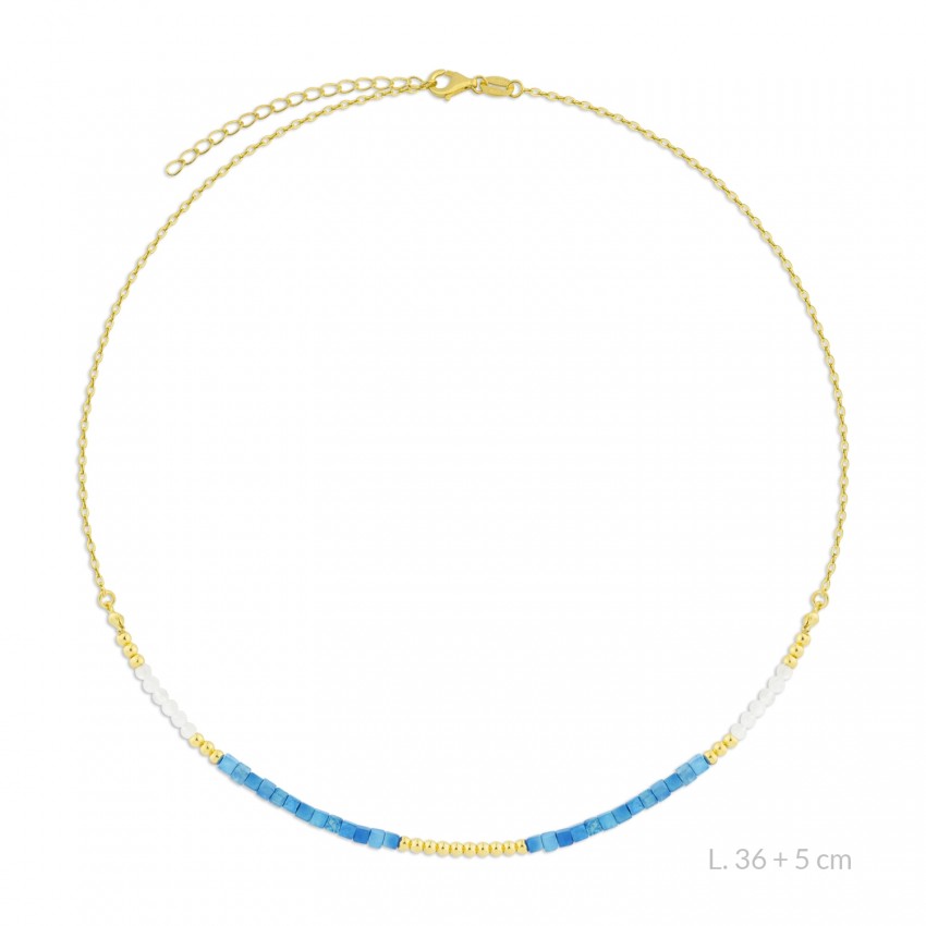 Gargantilla de Plata de Ley chapada en oro con turquesa, cuarzo blanco facetado de 2 mm y detalles con bolitas de plata. La piedra natural puede tener variaciones de color.