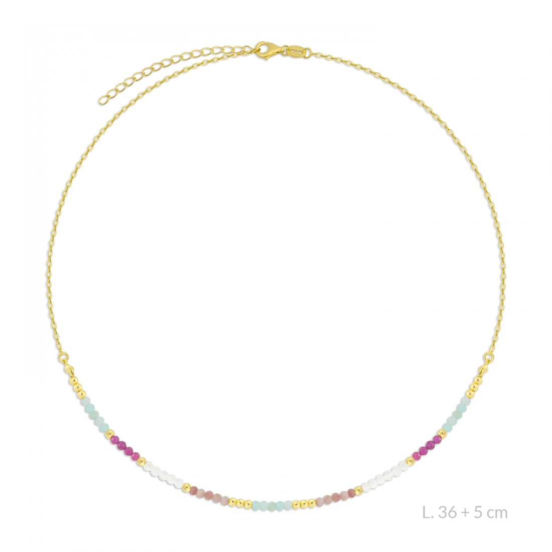 Gargantilla de Plata de Ley chapada en oro con aguamarina, cuarzo blanco, cuarzo fresa, cuarzo rosa facetados de 2 mm y detalles con bolitas de plata. La piedra natural puede tener variaciones de color.