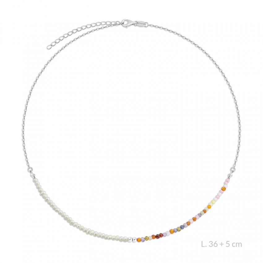 Gargantilla de Plata de Ley con perla barroca, rocalla facetada multicolor de 2 mm y 2 bolitas de plata. Tanto la piedra natural como la perla puede tener variaciones de color y tamaño.