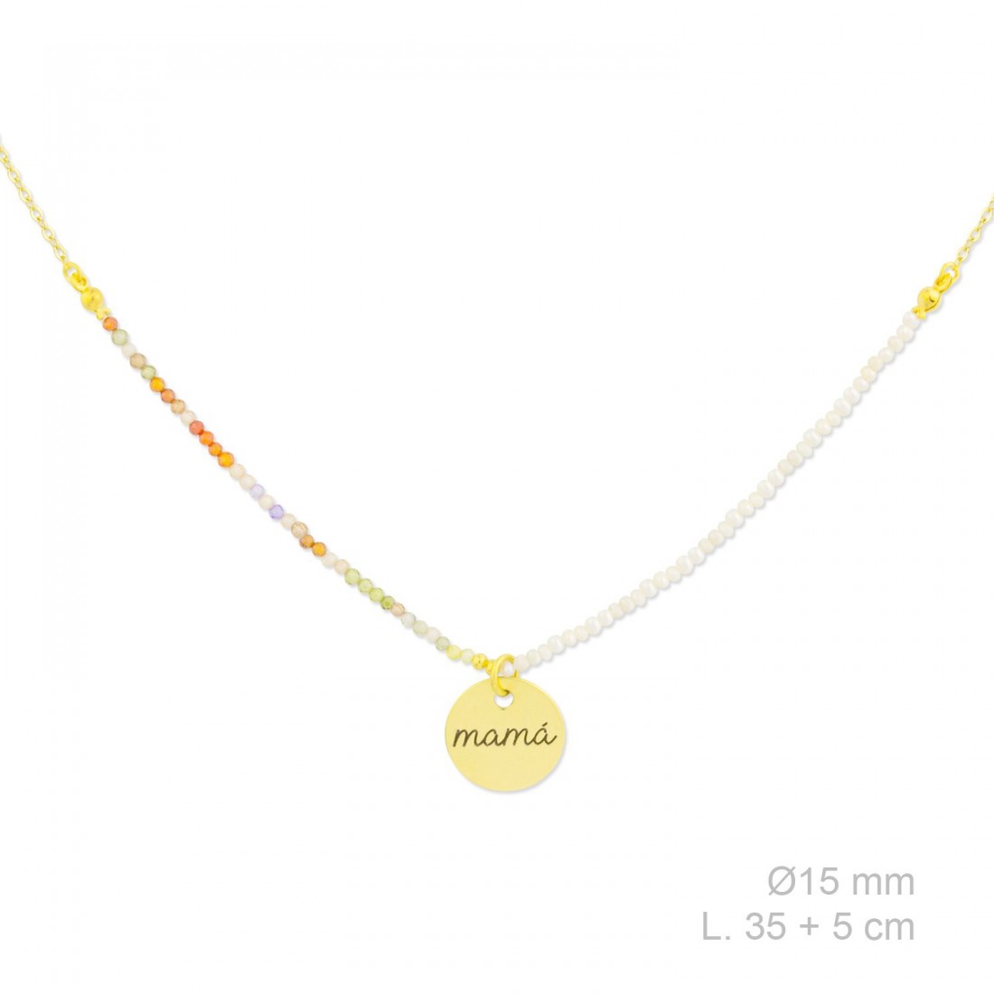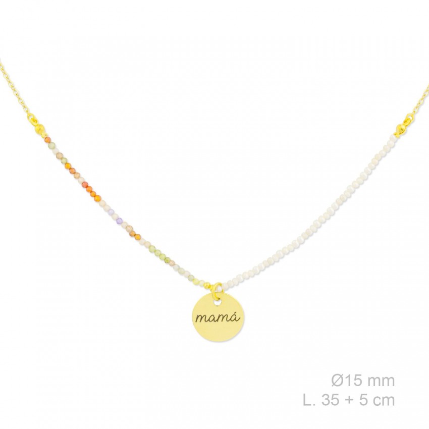 Gargantilla de Plata de Ley chapada en oro con perla barroca y rocalla facetada multicolor de 2 mm. Motivo de Ø15 mm con la palabra MAMA.