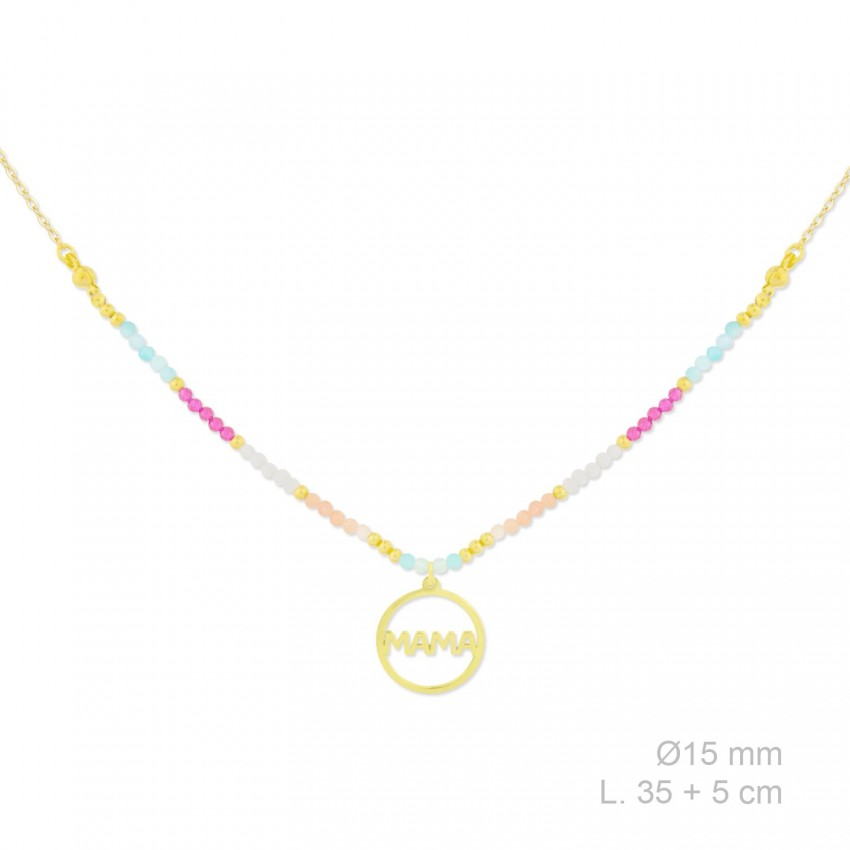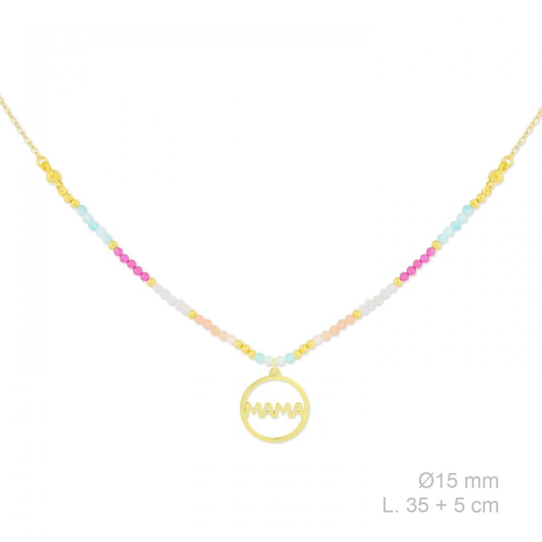 Gargantilla de Plata de Ley chapada en oro con aguamarina, cuarzo blanco, cuarzo fresa, cuarzo rosa facetados de 2 mm y detalles con bolitas de plata. Motivo de Ø15 mm con la palabra MAMA.