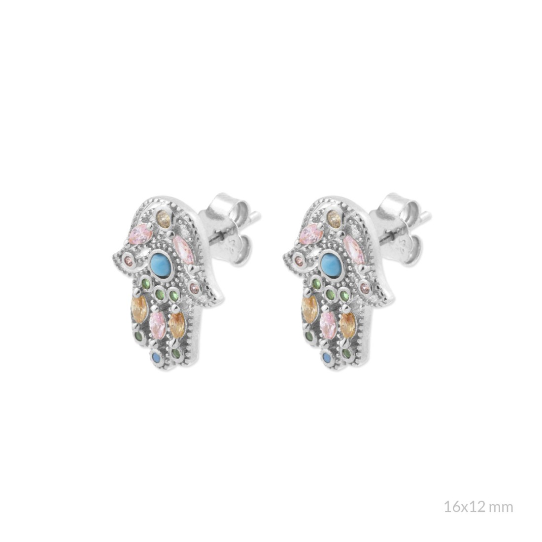 Pendientes de Plata de Ley con la Mano de Fátima, circonitas de color y turquesa.