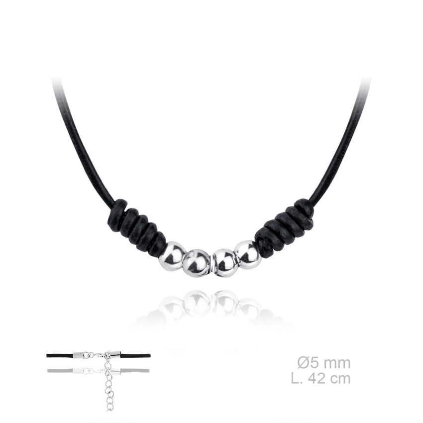 Gargantilla de cuero negro y 4 bolitas con terminales de Plata de Ley | L. 42+5cm