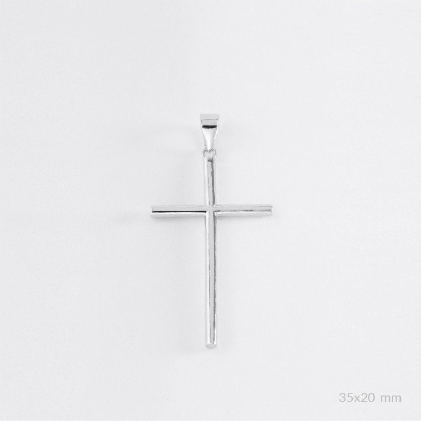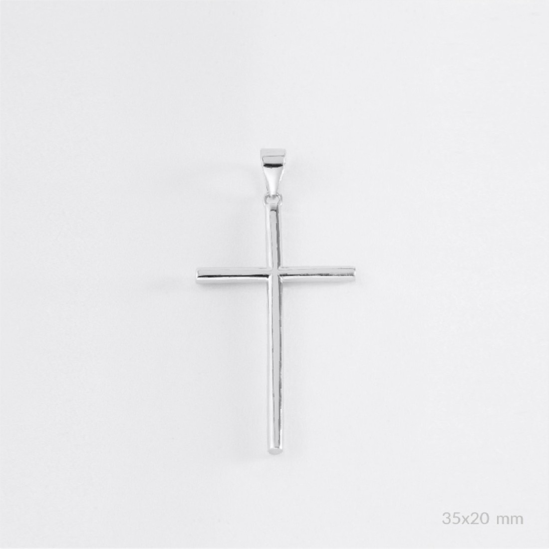 Colgante cruz de Plata de Ley. Tamaño: 35x20 cm aprox. Grosor: 2 mm aprox. Acabado: brillo. No incluye cadena. Incluye caja.