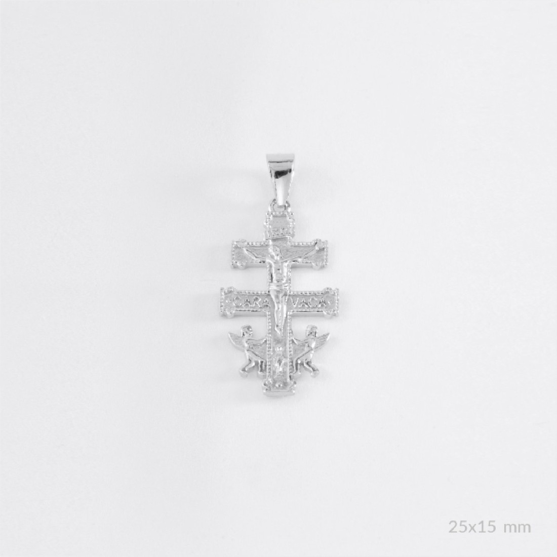 Podemos ver un exquisito relieve de la Cruz de Caravaca. Delicado colgante que representa la muerte y resurrección de Jesús para redimir a la humanidad.