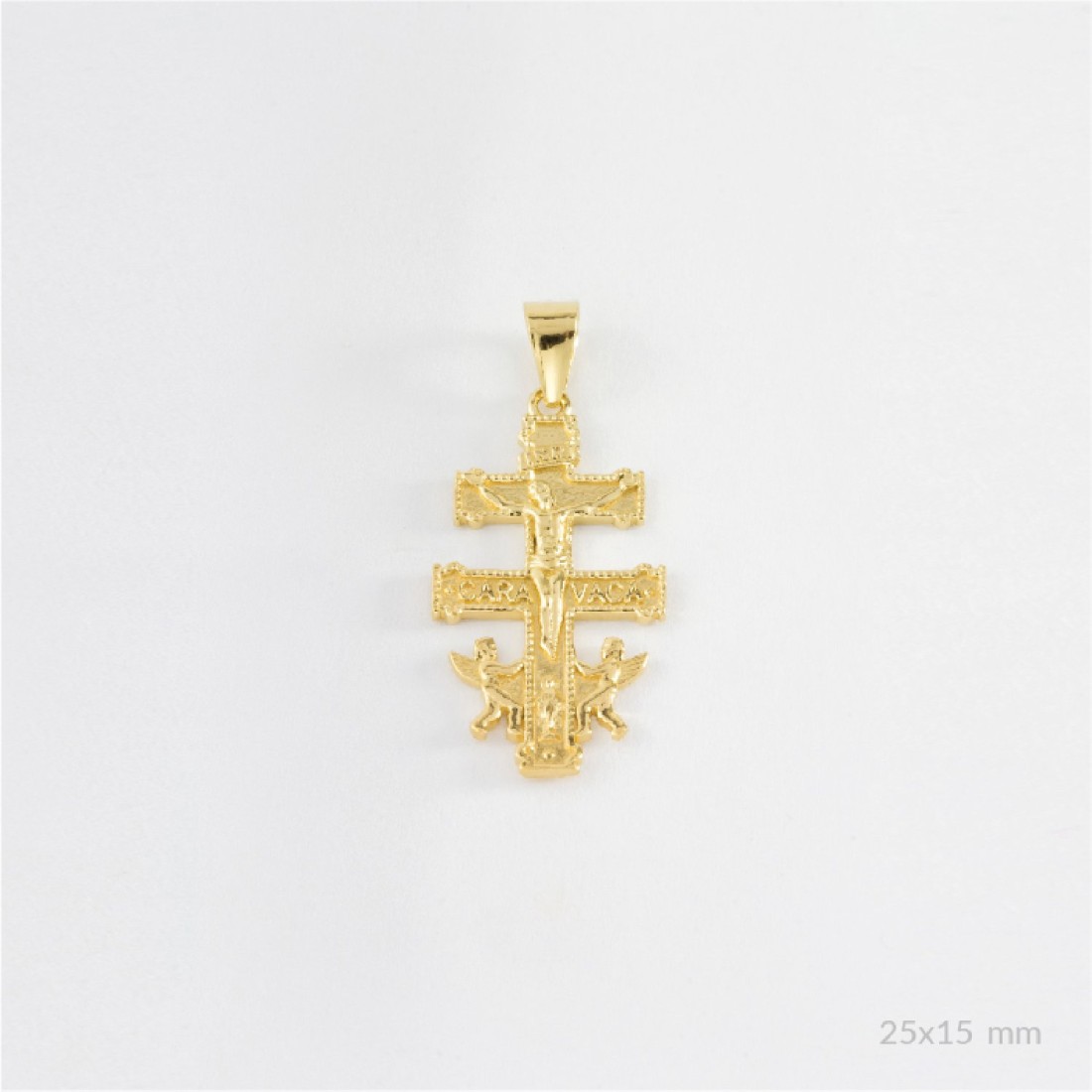 Podemos ver un exquisito relieve de la Cruz de Caravaca. Delicado colgante que representa la muerte y resurrección de Jesús para redimir a la humanidad.